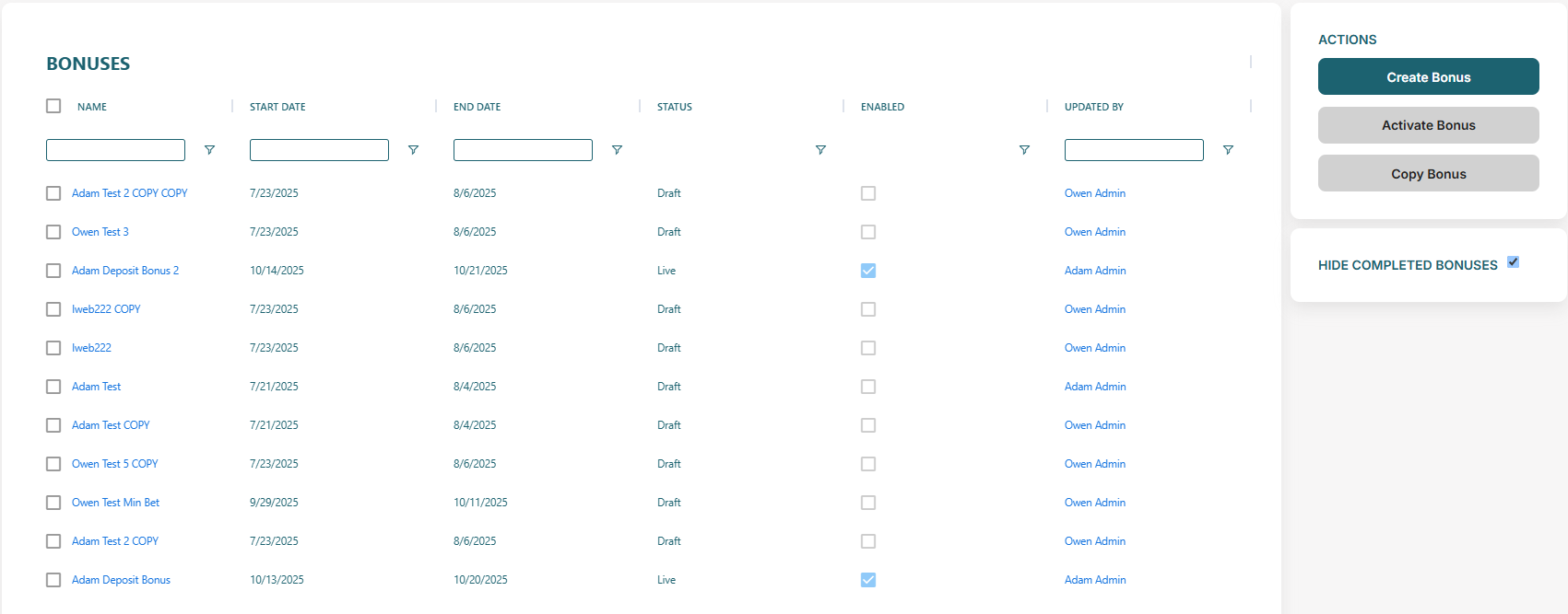 Fields include the name of the bonus, start date, end date, status (draft/live), enabled status and the user to last updade the bonus. Click in the name of a bonus to enter View Bonus.