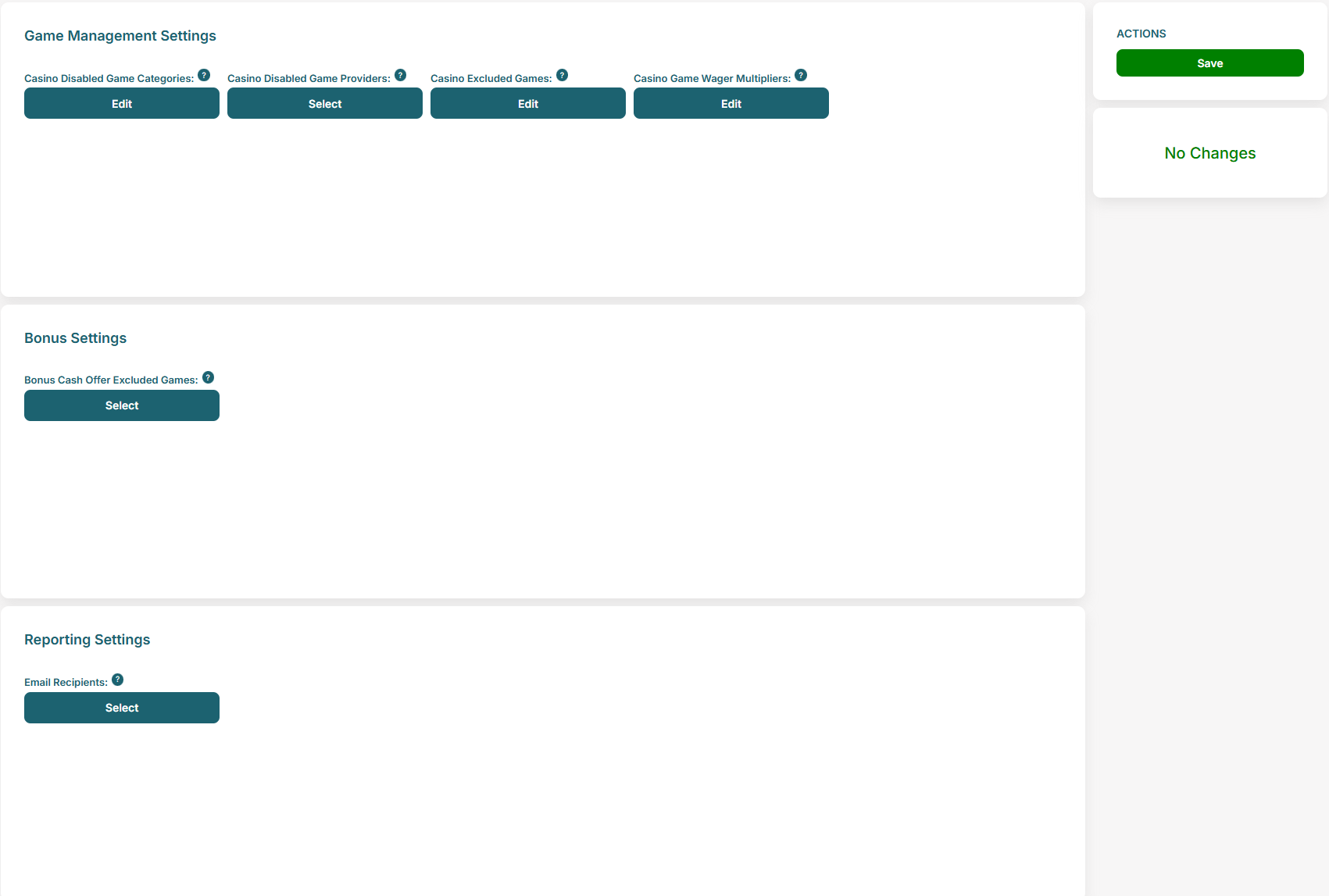 The configuration tab provides administrators the ability to manage aspects of the casino from the Back Office in a self service manner.