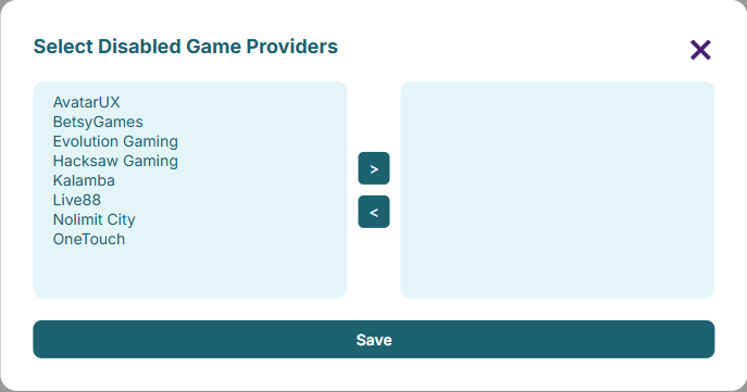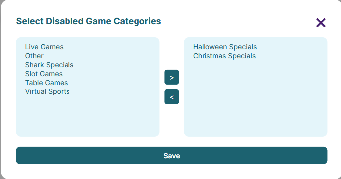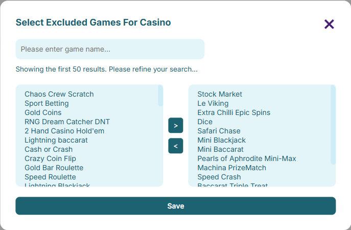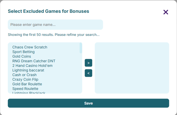 Games can be added to the preset list so when bonuses are created the exclusion list automatically includes these items. See Cash Offers