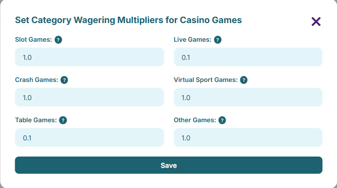 Wager multipliers can be configured per category. This applies a multiplier to bonus wagering and VIP XP gain, this can be set lower than one for table games for instance.