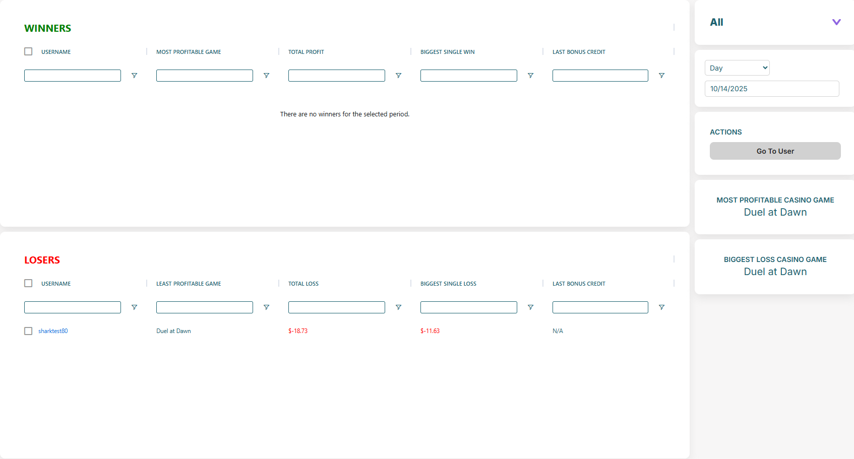 - Total Win/Loss for the player in the time period.